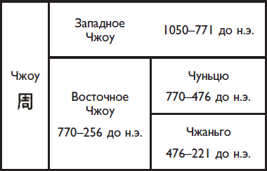 Династия Чжоу просуществовала до 256 г. до н. э., то есть более 700 лет. Этот большой временной промежуток также делится на несколько периодов: Западное Чжоу (1027–771 до н. э.), когда столицей царства был город Фэнхао, и Восточное Чжоу (770–256 до н. э.), когда столицей стал город Лои. Восточное Чжоу также включает два периода: Вёсен и Осеней (Чуньцю, 770–476 до н. э.) и Сражающихся царств (Чжаньго, 476–221 до н. э.).