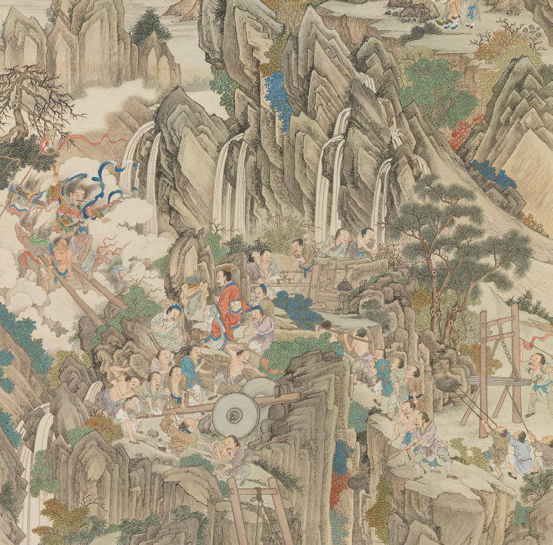 Великий Юй (в красном) вместе с народом и богами (на облаках) обрушивает гору, чтобы остановить воды потопа. «Великий Юй усмиряет потоп». Художник Се Суй. Эпоха Цин. Музей Гугун, Тайбэй