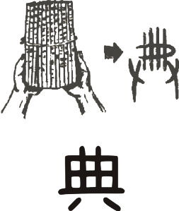 Древнее изображение иероглифа 典 (дянь), означающего «закон», «классический документ», «трактат», было обнаружено на гадальных костях эпохи Шан. Выглядело оно как две руки, держащие бамбуковую книгу. Однако самые ранние находки таких книг относятся к периоду Сражающихся царств
