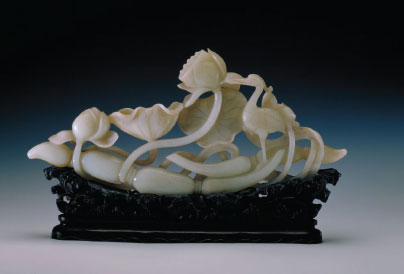 Нефритовая фигурка с изображением лотоса и белой цапли. Могла служить подарком кандидату на чиновничью должность, поскольку «лотос» и «цапля» в китайском языке созвучны со словами из пожелания успешной сдачи экзаменов. Эпоха Цин. Музей Гугун, Пекин