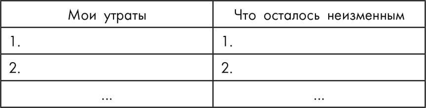 Разделите лист бумаги на две колонки. Одна колонка будет называться: МОИ УТРАТЫ, вторая – ЧТО ОСТАЛОСЬ НЕИЗМЕННЫМ. В колонку с утратами вы пишете списком то, что действительно потеряли из-за кризиса. Например, работу, клиентов, возможность путешествовать, иметь помощницу по дому, общение с друзьями, отношения с мужем и т. д. Что-то очень конкретное и измеримое. Только не пишите: ВСЕ УТРАТИЛ/А. Пока мы живы, это не так.