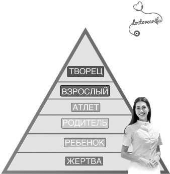Перед вами пирамида, которая поделена на 6 сегментов. Каждому уровню соответствует определенный тип личности: жертва, ребенок, родитель, атлет, взрослый, творец. Чем больше сегмент и чем ниже он к основанию пирамиды (к широкой нижней части), тем, соответственно, большее число людей можно отнести к типам личности, не находящихся в своем идеальном весе и хорошем состоянии здоровья. И наоборот, чем меньше сегмент и чем выше он к вершине пирамиды (к маленькой треугольной верхней части), тем меньшее число людей, находящихся в нормальном весе тела и здоровых взаимоотношениях с пищей, он вовлекает. И с этим сложно поспорить. Достаточно взглянуть на общеизвестные статические данные и изучить тенденции, связанные с весом тела населения планеты и заболеваниями людей в разных странах мира.