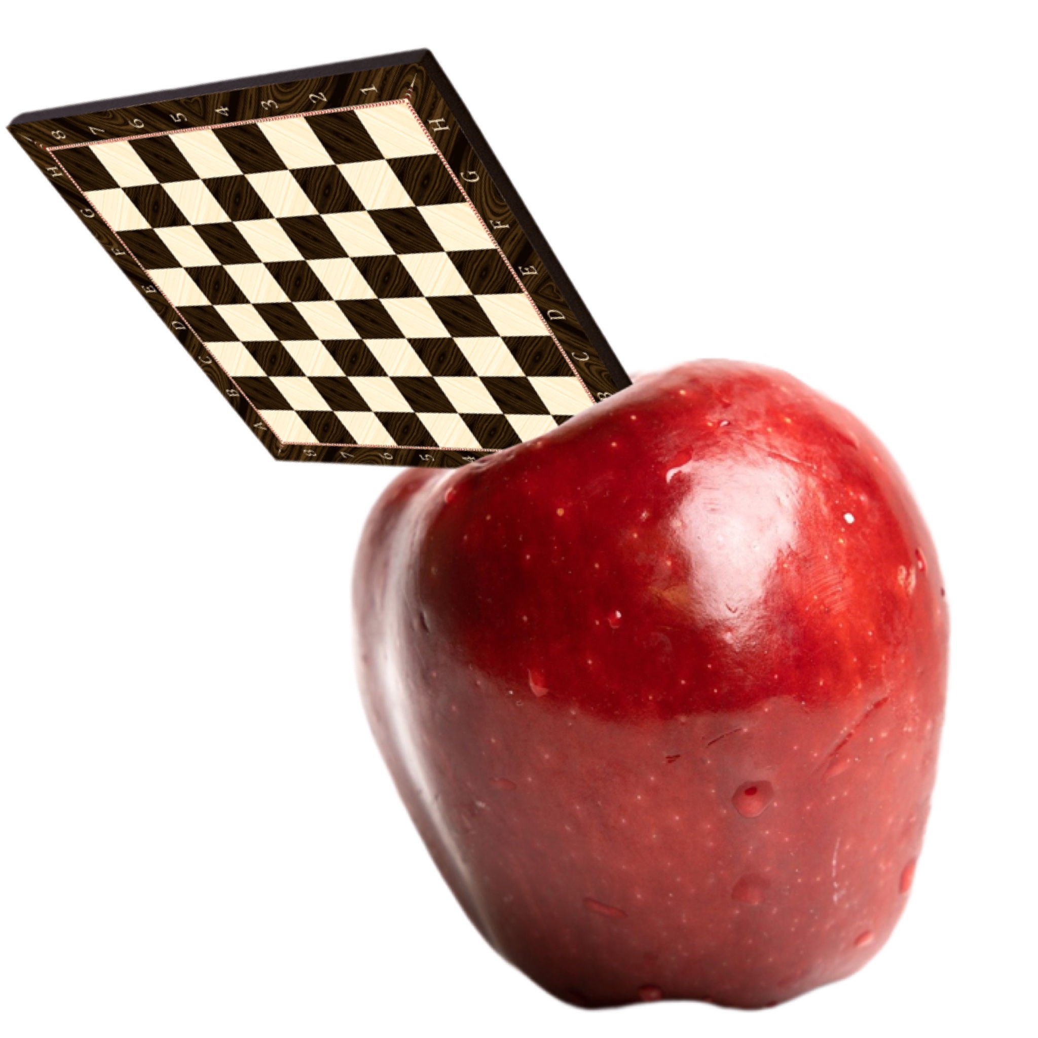 Далее вместо черенка яблока вставьте туда острый угол шахматной доски.