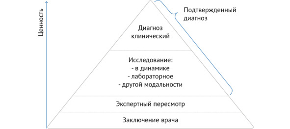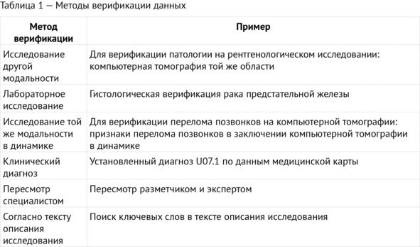 Наименьшей ценностью обладает верификация по заключению врача, т.е. вывод о наличии или отсутствии патологии делается на основании заключения врача, описывавшего исследование. Как правило, такой способ разметки используется на первых этапах отбора данных и может быть осуществлен с помощью алгоритмов автоматического анализа текстовых протоколов, например MedLabel12. Следующим по ценности методом верификации является экспертный пересмотр: слепой анализ исследований врачами-экспертами с достижением заданного уровня согласованности их решений (подробно описан в подпараграфе 3.3.2 «Разметка данных»). Следующие две группы методов являются наиболее достоверными, и их можно условно назвать «подтвержденный диагноз»: исследование той же модальности в динамике, исследование другой модальности, лабораторное исследование, которые в совокупности с остальными данными медицинской карты дают клинический диагноз. Стоит отметить, что для верификации каждой патологии существует свой метод «золотого стандарта», который позволяет подтвердить диагноз.