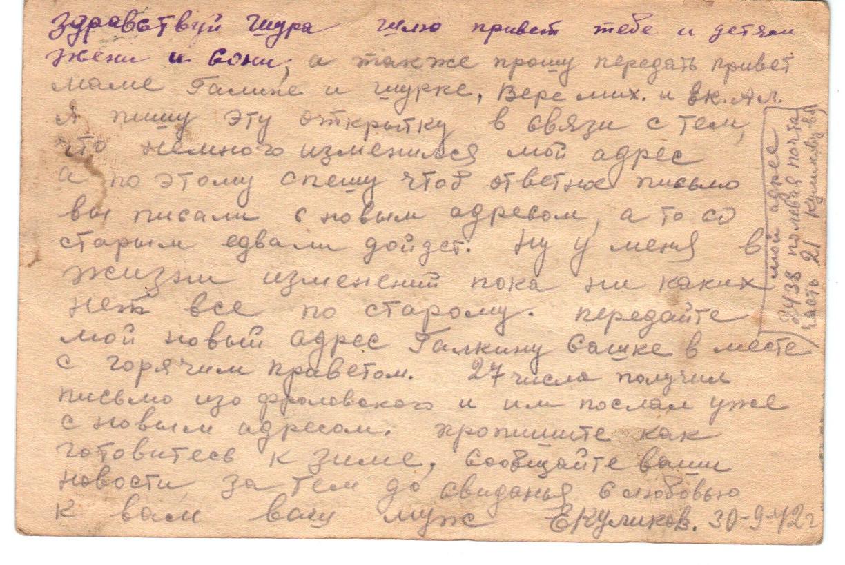 Письмо о последнем бое Куликова Е. Я. для его жены и дочери.