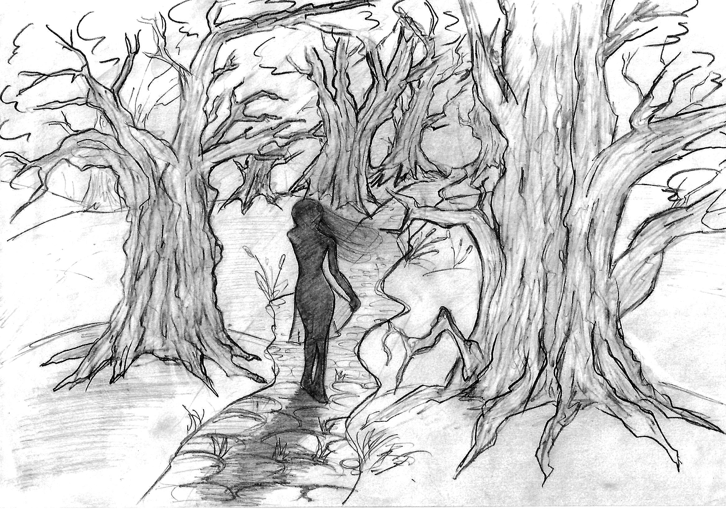 День был теплый, на мне было легкое длинное платье, чёрный кардиган и туфли на плоской подошве. Пока все были заняты, я попыталась незаметно скрыться, но тут меня застала Мария. Мне ничего не оставалось, кроме как применить на ней гипноз, чтобы она от меня отвязалась и забыла обо мне на некоторое время. Мой трюк сработал, что не удивительно, и на этот раз мне ничего не мешало, по крайней мере, я так думала. Чем ближе я была к заветному лесу, тем сильнее и отчетливее становилась видна речка, служившая некой «преградой», на которой я сначала пыталась отыскать какой ни будь мостик, но не найдя ничего, напоминающего переправу, мне осталось только одно – на пролом! Я сняла туфли, приподняла подол платья повыше и ступила в воду: речка оказалось не глубокой, но ужасно ледяной! Ну, естественно, лето у нас короткое и холодное, слава богу, в этот день было довольно тепло. Я пыталась передвигаться как можно быстрее, терпя острую боль, чтобы поскорее миновать препятствие. На поверхности воды прыгали солнечные зайчики, которые так и норовили меня ослепить, из-за этого меня слегка пошатывало, и потому шла, не разбирая дороги. Наконец, я оказалась на противоположном берегу на полянке, засыпанной клевером и прочей луговой растительностью. Ногам было так холодно, что я их почти не чувствовала, а от них разносился холод и по всему телу. Я, конечно, люблю мороз больше лета, но не настолько, чтобы добровольно отморозить ноги. Лишь когда обрела чувствительность в них, обулась и направилась прямо к своей цели. Оказавшись «на краю» леса, я остановилась и начала вглядываться в темноту: кроны деревьев были настолько густыми, что почти не пропускали свет, из-за этого в лесу было сумрачно, и я толком ничего не разглядела. Собрав волю в кулак и задрав нос, я твердой походкой вошла во мглу. Пройдя немного, обернулась: всё та же ледяная река шумит, цветущая полянка, холм, за которым находится стоянка, солнце палит вовсю. Посмотрела вперед: темнота, гробовая тишина, ни лучика солнца. Создалось впечатление, что я сейчас стою на пересечении разных миров – человеческим и миром монстров. Но, каким бы неприветливым ни был второй, я продолжила идти вперед. На этот раз я прошла немного меньше и снова обернулась… за моей спиной оказался мрак. Я подумала, что не могла уйти так далеко, и решила пойти обратно. Не знаю точно, сколько времени я шла, но, ни реки, ни холма, ни цветочной поляны не было и в помине. Я насторожилась и начала оглядываться по сторонам: тишина, таинственная и пугающая, ни капельки света, высокие деревья с густой черной, будто каменной листвой и ветвями, сплетающимися у меня над головой, словно паутина, которая не давала даже маленькому лучику света и малейшего шанса коснуться земли. В воздухе застыл холод, всё вокруг было покрыто тонким слоем инея.