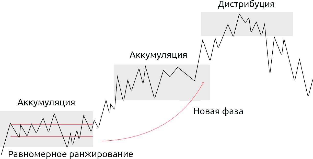 Это стандартная схема, как проходит аккумуляция. Далее, идёт новая фаза аккумуляции, после чего следует Дистрибуция. Девиз: «Покупай дёшево, продавай дорого!», – в работе. Посмотрим на это, как на аукцион. Кто-то купил по дешёвке много товара. Он тестирует рынок, выставляя товар по разным ценам. Если видит, что товар пользуется спросом, то взвинчивает цену. Если весь товар разобрали, а возможности его произвести нет, то надо опустить цену, чтобы опять купить по дешёвке. В этом вся суть фондового рынка. Для того, чтобы глубже понимать его язык, мы должны разобрать основы. Если вы научитесь читать структуру рынка, то у вас появится чёткое понимание того, что на нём происходит и куда он движется.