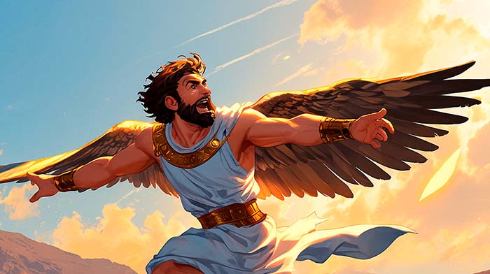 Согласно древнегреческому мифу, Дедал, искусный архитектор и изобретатель, создал для себя и своего сына Икара пару крыльев, сделанных из воска и перьев, чтобы они могли улететь из заключения на острове Крит.