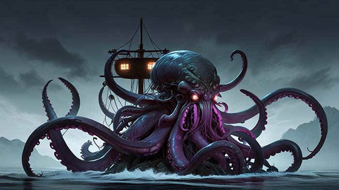 По легенде, кракен способен высовывать свои огромные щупальца из глубины морской воды и обвивать ими корабли, чтобы топить их. Многие уверены, что он ответственен за массовые и загадочные исчезновения судов и матросов в море.