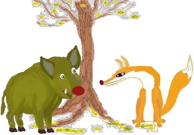 Так лиса добрела до старого, высокого дуба. «О, кабанчик тут», – обрадовалась лиса.