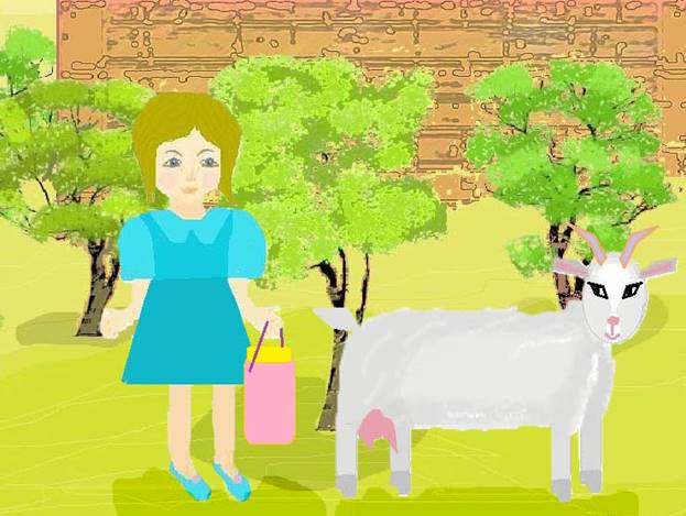 Подоївши козу, Тетянка віддала бабусі бідончик з молоком, а сама почала розчісувати Маню.