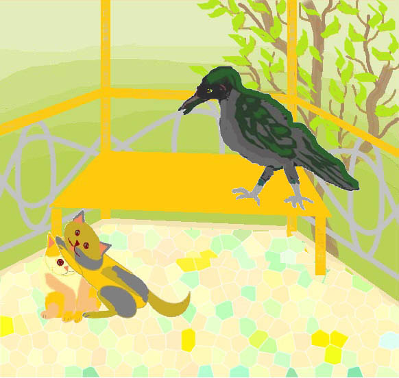 Підійшовши до альтанки, кошеня побачив, що його сестричка Красунка забилася в куток, а до неї наближається величезна страшна ворона.