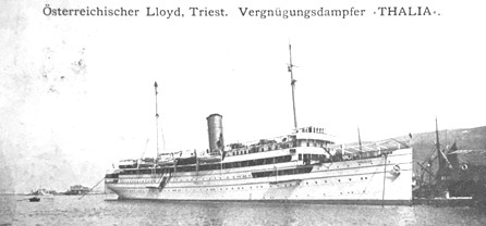 Indes, eines holden Tages, im Herbst 1919, stand ich wieder auf dem Verdeck eines Schiffes, das aus dem Hafen von Triest abdampfte, ich lehnte an der Reeling, erfüllt von der wunderbaren Empfindung: Jetzt bist du wiederum Seefahrer! Jetzt geht's hinaus in nähere und entlegene Meere! – Und ich sah, wie die Häuser von Triest kleiner und kleiner wurden.