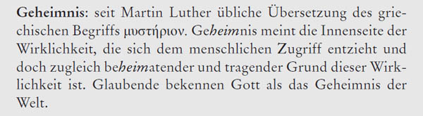 Ein Geheimnis hat – solange es nicht zum angstbesetzten, zerstörerischen Tabu wird, sondern Freiheit, Ehrfurcht und Demut atmet – etwas Bergendes, Schützendes. Im Geheimnis kann ein Mensch daheim sein und Vertrauen in die Gutheit seines Lebens finden. Genau darum geht es wohl verstanden im christlichen Glauben. Der Glaube will beheimaten, bergen, wärmen und behüten. Doch tut er das recht verstanden nicht, indem er Gott und die Welt durchschaut und für alles eine glatte Antwort bietet. Vielmehr nähert er sich scheu und mit größter Vorsicht dem Geheimnis. Im Glauben wird das Geheimnis Gottes und des Lebens größer, nicht kleiner. Aber gerade dadurch immer wunderbarer.