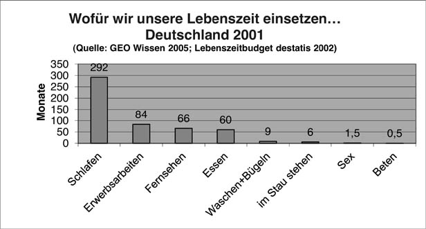 Eine Lebenszeitbudgetanalyse des deutschen Statistischen Bundesamts destatis von 2001/2002 zeigt, dass jedeR Deutsche im Laufe seines bzw. ihres Lebens durchschnittlich rund zwei Wochen für das Beten verwendet. Zwei Wochen – einen halben Monat, ungefähr 0,5 Promille der Lebenszeit. Der Zeitanteil des Gebets am gesamten Leben und Erleben ist damit extrem gering. Es scheint, als sei das Gebet für das durchschnittliche menschliche Leben in der modernen Industriegesellschaft ziemlich unwichtig.