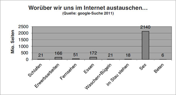 Eher schon könnte heute die Zahl einschlägiger Internetseiten ein grober Indikator für die Wichtigkeit eines Gegenstands sein. Was den Menschen wichtig ist, darüber werden sie sich in dem Medium austauschen, das zum ersten und wichtigsten Kommunikationsort geworden ist. Und in der Tat: Nimmt man eine Suchmaschine und gibt die Schlagworte der zitierten Lebenszeitbudgetanalyse von destatis ein, dann holt das Gebet gegenüber allen Vollzügen außer der Sexualität deutlich auf. Zwar bleibt es mit 6 Mio. Internetseiten weiterhin das Schlusslicht, doch der Abstand hat sich deutlich verringert. Offenbar geht es um einen für viele Menschen auch in der Moderne wichtigen Grundvollzug.