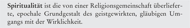 3) Spiritualität ist eine »Gestalt des Glaubens« (Bernhard Fraling 1970, 193): Sie ist mehr als eine bloße innere Grundhaltung, etwa der Hingabe, des gläubigen Vertrauens, der Hoffnung (vgl. Hans Urs von Balthasar 1965, 715). Sie umfasst diese zweifellos, schließt aber zudem deren geschichtlich bedingten, je konkreten Ausdruck ein, ist also »fleischgewordene«, in einem Lebensstil gelebte Grundhaltung.