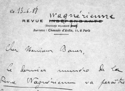 That same year, patrons of the Concerts Lamoureux were offered copies of a new magazine called the Revue wagnérienne. It was the brainchild of Édouard Dujardin, the twenty-three-year-old son of a sea captain who supported his literary endeavors with a stipend from his parents. Dujardin also worked out a system for winning at the racetrack, which boosted his coffers until he tried to break the bank at Monte Carlo. Dandyish and bemonocled, Dujardin wore a red vest embroidered with tiny swans, in honor of Lohengrin. He caught the Wagner virus in May 1882, when he heard the Ring in London. That summer, he went to Bayreuth for the premiere of Parsifal, and at the following year’s festival he greeted French arrivals at the railway station by blowing discordantly on a horn in what he believed to be a Siegfried manner.