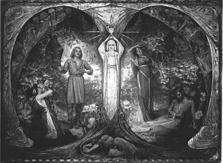 The World Crusade had a destination in view: Point Loma, California, a Theosophical utopia outside San Diego, overlooking the Pacific Ocean. The complex included a Temple of Peace, the Raja Yoga Academy, and an open-air Greek theater. On seeing it, the actor Helena Modjeska exclaimed, “A second Bayreuth!” Nellie Melba said that the scene reminded her of her first experience of Parsifal. A group of Parsifal paintings by the Theosophical artist Reginald Machell, an Englishman who had settled in Point Loma, exemplified the Tingley vision; in two of them a guru-like figure holds the Grail over his head, his arms forming a sacred geometry with the cup. “Every conqueror of himself conquers also for others,” Machell explained.