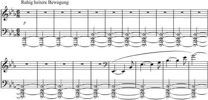 In the beginning was the tone: octave E-flats in the double basses, sustained in a barely audible rumble. Five bars in, bassoons add a pair of B-flats, five steps higher. Together, these notes form the interval of the perfect fifth. Like the fifth that glimmers at the start of Beethoven’s Ninth Symphony, it is an emanation of primordial nature, the hum of the cosmos at rest. Then eight horns enter one after another, in upward-wheeling patterns, which resemble the natural harmonic series generated by a vibrating string. Other instruments add their voices, in gradually quickening pulses. As the mass of sound gathers and swirls and billows in the air, the underlying tonality of E-flat does not budge. Only after 136 bars—four to five minutes in performance—does the harmony change, tilting toward A-flat. The prolonged stasis engenders a new sense of time, although it is difficult to say what kind of time it is: perhaps an instant passing in slow motion, perhaps eons passing in a blur.