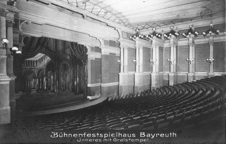 The interior was even more jarring to nineteenth-century sensibilities. Traditional opera houses conform to a horseshoe shape, with many of the boxes facing one another—an arrangement conducive to social display. Bayreuth has a fan-shaped array of steeply raked rows, like a section lifted from a Greek amphitheater, so that every seat is angled toward the stage. Two proscenia are nested inside each other, drawing all eyes forward. The pit is set unusually deep, removing the musicians and the conductor from the field of vision. In an acoustical miracle that has never been fully explained, the orchestral sound diffuses richly through the auditorium, even though it must pass through an aperture in front of the stage. Modestly adorned columns line the sides of the auditorium. Hard-backed seats keep the listener awake and alert. In an 1873 essay, Wagner headily summarized the intended effect on the spectator: