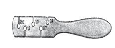 Эта стальная пластина имеет несколько щелей разной величины для развода зубьев пил с различной толщиной полотна.