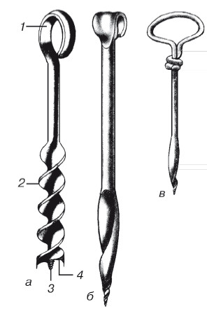 а – цилиндрический винтообразный; б – улиткообразный; в – буравчик; 1 —ушко; 2—рабочая часть; 3—режущая кромка; 4 – заборный винт