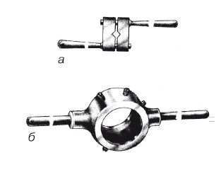 Вороток (а) и плашкодержатель (б) – на рис. 1.38. Эти инструменты-приспособления служат для крепления и вращения вручную метчиков, нарезных плашек и пр. для нарезания резьбы.