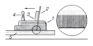 1 – корпус; 2 – нож; 3 – клин; 4—ручка-рог; 5 – обрабатываемая поверхность