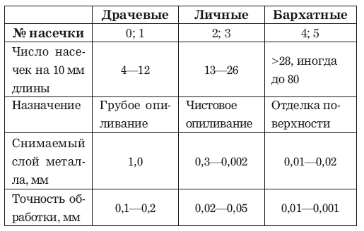 Его рабочие свойства определяет шаг насечки (число насечек, приходящихся на 10 мм длины бруска) или номер насечки. Различают напильники: драчевые (шаг насечки 4,5—12, номер насечки 0–1) для грубого или предварительного опиливания; полуличные, личные (13–26; 2–3); бархатные (42–80; 4–5) для чистового опиливания, шлифования, доводки деталей. Напильник с крупной насечкой – это рашпиль, с мелкой – надфиль, применяемый для самых тонких, ювелирных операций (он маленький, не имеет хвостовика).