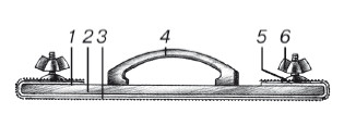 1 – корпус; 2 – передняя ручка; 3 – прижим; 4 – винты для регулировки положения ножа; 5—задняя ручка;6—нож