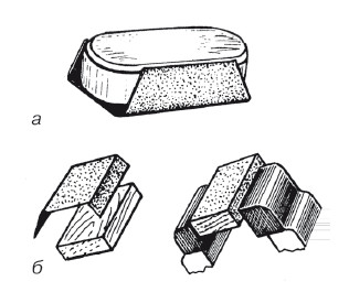 Поверхность лучше обрабатывать не самой шлифовальной шкуркой, а наждачным бруском или теркой-зачисткой (рис. 1.49). Умельцы придумали и другие отличные приспособления. Скажем, разъемная «мыльница» (рис. 1.50, а), в которой с двух сторон закреплен кусок наждачной бумаги (края загнуты внутрь). Похожим инструментом может стать спичечный коробок. А «шлифовальный станок», показанный на рис. 1.50, б, пригодится для обработки мелких деталей: наждачная бумага наложена на брусок, края загнуты, а брусок зажат в тисках.