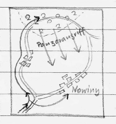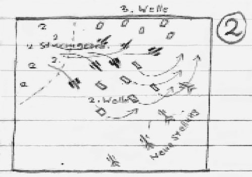 Будучи картографом разведгруппы, Ганс Рот постоянно наносил на карту самые различные планы атак 299-й пехотной дивизии. Здесь в его первом дневнике помещена схема окружения города Новины с одновременной танковой атакой