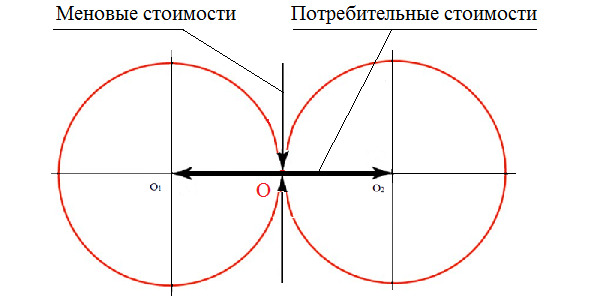 Пытаясь свести различные формы обмена к единому основанию, рассмотрим общую структуру меновых отношений, используя для этой цели диалектический метод. Как и К. Маркс, возьмем отдельный товар и рассмотрим его с двоякой точки зрения: как потребительную стоимость и как меновую стоимость. При этом обнаруживаем, что обмен товаров («клеточка») – это не самый простой процесс, поскольку представляет собой совокупность двух более элементарных процессов: «предложения» и «спроса», каждый из которых является отношением противоположных тенденции. Но в таком случае меновый процесс обусловлен единством не двух, а четырех сторон: двух меновых и двух потребительных стоимостей.