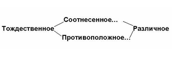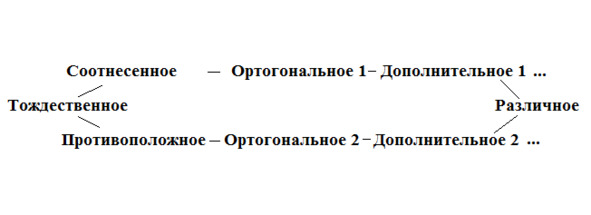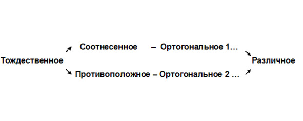 При этом один из аристотелевских видов противолежания – «противоречащее» – мы разделили на две части – на два совершенно самостоятельных сравнительных понятия: «Тождественное»: А = А. И «Различное»: А и не-А. Тогда как три других вида противолежания: «соотнесенное», «лишенность и обладание» и «противоположное», напротив, объединили в один вид, вводя для него общий термин – «градационное».