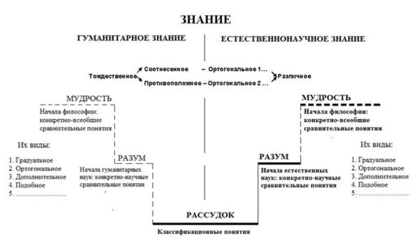 Важным здесь является то, что деление языковых средств на классификационные, количественные, конкретно-научные и конкретно-всеобщие сравнительные понятия градационного (Аристотель), ортогонального (Пифагор, Гераклит) и других видов, позволило провести демаркацию между тремя принципиально разными ступенями в развитии человеческого ума: рассудком, разумом и мудростью.