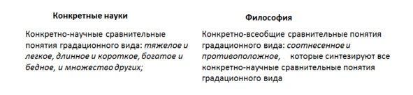 На этих примерах показана принципиально важная связь между множеством конкретно-научных сравнительных понятий градационного вида (особенное), как началами конкретных наук и двумя, выделенными Аристотелем конкретно-всеобщими сравнительными понятиями градационного вида (общее) – «Соотнесенным» и «Противоположным», как началами научной философии, т.е. метапреметными понятиями, направленными на интеграцию знаний.