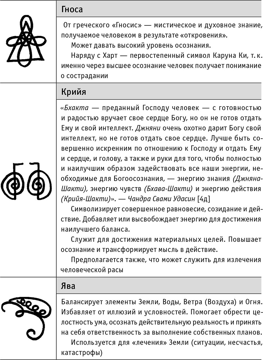«Прошлым летом (имеется в виду 2000 год) я получила новые символы. Они входят в систему под названием «Рэй-Ки фиолетового пламени». Эта система не больше и не лучше, чем Усуи Рэй-Ки. Это старые символы, которые были мною получены, когда я читала мантру на санскрите, предназначенную для обращения к Гуань Шинь и исцеления сердца: «Намо Гуань Шинь Пуса» (Я приветствую Бодхисаттву, которая с милосердием внимает голосу мира). Увидев символы, я записала их так быстро, как только смогла, чтобы не утерять информацию.
