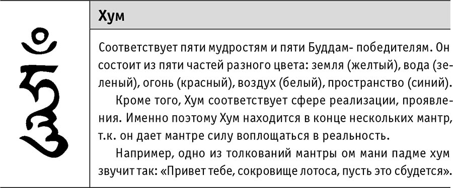 ОМ МАНИ ПАДМЕ ХУММантра пробуждает в сердце энергию сострадания и имеет название «шестислоговая», которое объясняется способностью шести слогов мантры спасать живых существ от рождения в шести юдолях сансары (адских миров, мира голодных духов, мира животных, мира людей, мира полубогов, мира богов), при этом каждый слог символизирует определенный мир.