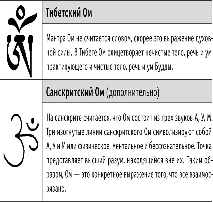 Ом состоит из трех звуков: a, у, м, которые олицетворяют полностью чистое и священные тело, речь и ум Будды Медицины. На пути просветления очищаются тело, речь и ум человека и он сам становится хозяином своей жизни и может эффективно помогать другим.