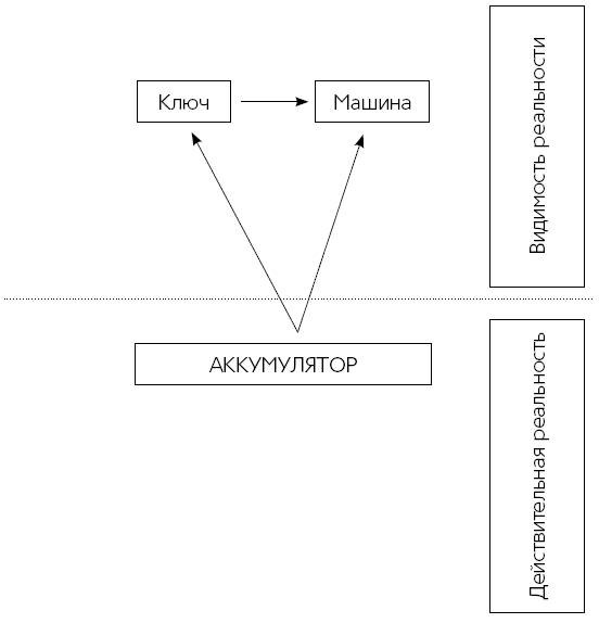 Только тогда, когда мы повернем ключ, а машина не заведется, мы будем вынуждены пойти дальше и перейти на третий уровень измерения. Этот уровень лежит под плоскостью «ключ – машина». Истинная причина скрыта от глаз под капотом и находится в разряженном аккумуляторе.