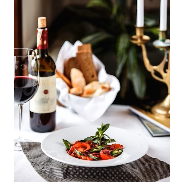 Она заказала курицу сувид с зелёным соусом, решив попробовать, что это такое, что оказалось невероятно нежно и вкусно, и салат из помидоров с моцареллой. Ещё королевские креветки гриль.