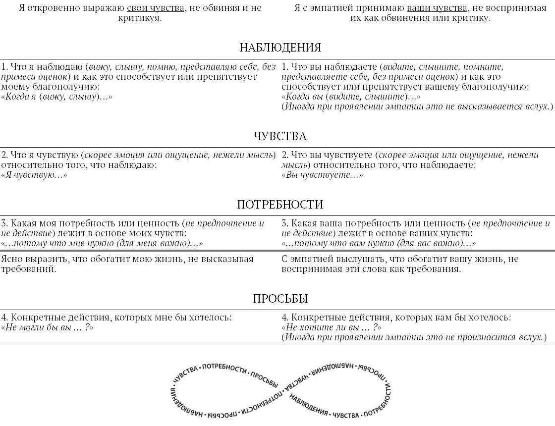 Процесс ННО показывает нам, как неприкрыто выражать самую свою суть, то, чем мы на самом деле живем в данный момент, – без какой-либо критики или попыток анализировать собеседника (что всегда подразумевает неправоту последнего). Процесс основан на предположении, что любое наше высказывание, которое может быть услышано собеседником как критика, анализ или любой другой намек на неправоту, препятствует установлению таких связей между людьми, которые способствовали бы благополучию всех участников общения. Такой подход сосредоточен именно на сопереживании – а не на страхе, чувстве вины, стыда, обвинении, принуждении или угрозе наказания – как на основной мотивации для действия. Иными словами, это способ получить то, чего мы хотим, по причинам, о которых не придется жалеть впоследствии. Одной из составляющих этого процесса является умение ясно и четко высказать, чем мы живем, без аналитики, критики и обвинений. Вторая составляющая – не менее четко сформулировать, что сделало бы нашу жизнь прекраснее, и донести эту информацию до собеседника в качестве просьбы, а не требования.