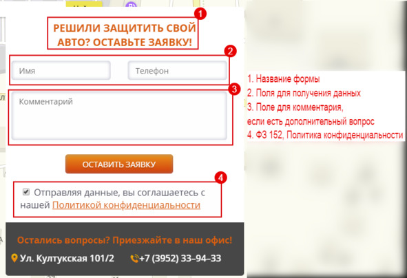Практический совет: один важный момент – не забывайте прописывать, в течение какого времени с потенциальным клиентом свяжется менеджер. Тут не надо приукрашивать свои возможности, лучше оставьте реальные цифры: в течение 10 минут, в течение дня, в течение 4 часов после запроса и т. д. Тогда потенциальный клиент будет примерно понимать, когда ему ждать звонка/письма от компании по своему обращению.