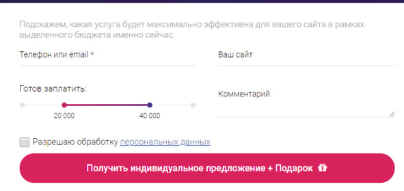 Практический совет: рекомендуем делать не более 5 полей для первого контакта. В дальнейшем, когда клиент оставит заявку и ваш процесс переговоров об исполнении начнется, можно будет предложить ему заполнить подробный бриф или анкету. Это действительно бывает необходимо для качественного оказания услуги. Но на начальных этапах такие огромные формы могут спугнуть пользователя.