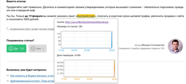 16 февраля у нас вышла статья «Поисковое продвижение сайтов: 15 популярных SEO-мифов», которая попала в контентную рассылку. В самой статье ни слова о наших услугах, но в конце – строка с оффером. В первые же сутки по ссылке на специальное предложение перешло 150 пользователей (14,6% от прочитавших статью), а мы получили 1 заказ на услугу стоимостью 35 400 р.: