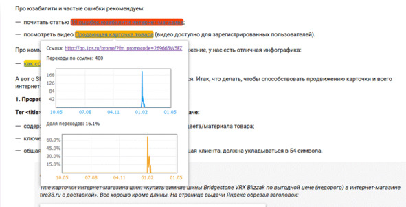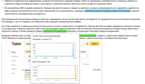 В статье «Как оптимизировать карточку товара» мы дали несколько практических рекомендаций, включая те работы, которые осуществляем сами. И дали ссылки на свои страницы с этими услугами. Получили 50 переходов на услугу «Поисковая оптимизация» и 10 переходов на услугу «Аудит сайта».
