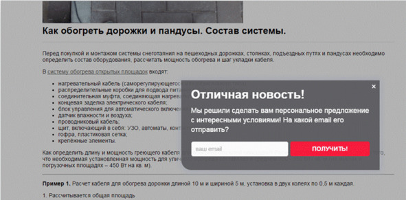 После двух минут присутствия на сайте компании по продаже систем обогрева (а мы туда попали через очень подробную специализированную статью в блоге, которую, собственно, и читали), всплывает такое окно: