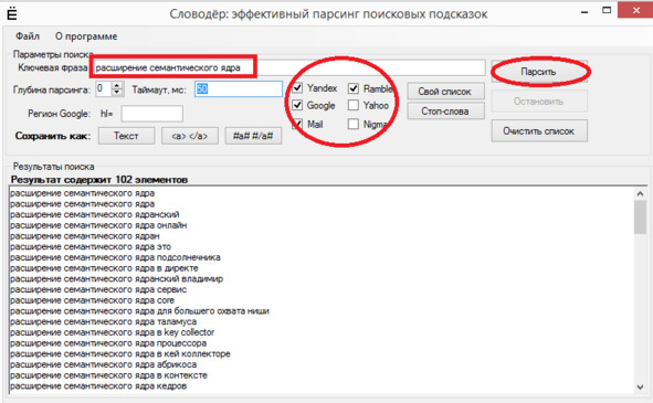 1. Словодёр – бесплатный сервис для парсинга поисковых подсказок из Яндекса, Google, Mail, Рамблер, Yahoo, Nigma. Простой и удобный в использовании. После скачивания откройте программу, укажите поисковый запрос, поисковые системы и нажмите «Парсить»: