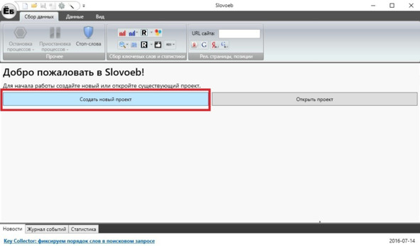3. Бесплатная программа SlovoEB на основе KeyCollector с урезанным функционалом, позволяющая собирать поисковые подсказки. Этого хватит, чтобы подобрать весь список поисковых подсказок из поисковиков. Для начала создаем новый проект: